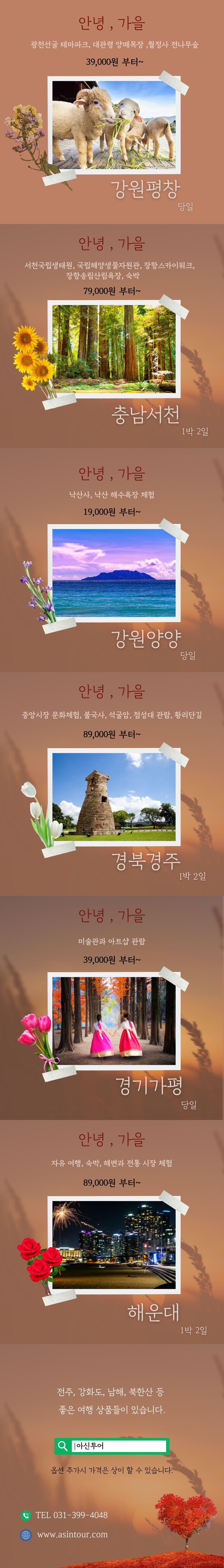 안녕하세요! 잘 지내고 계셨나요?​아신투어가 의미 있는 여행을 위해한참을 고민했습니다😭 그리고 좋은 여행 상품으로 가져왔는데요!바로 가을맞이 추천 여행인데요~많은 분들이 찾아주시고 관심 가져주셨던 여행입니다!소개해 드리겠습니다^^ 첫번째는 강원도 평창입니다광천선굴과 양떼목장, 월정사 전나무숲을 체험하고관람하면서 눈 호강할 수 있는 여행입니다. 두번째는 충남 서천입니다서천 국립생태원, 국립 해양생물자원관, 장항 스카이워크, 장항송림 산림욕장숙박까지 포함하여 알차고 저렴하고 굉장히 인기 있는 여행입니다. 세 번째는 강원 양양입니다낙산사, 낙산해수욕장 체험까지 맑은 공기를 마시며행복한 시간을 보낼 수 있는 여행입니다. 네 번째는 경북 경주입니다중앙시장, 불국사, 석굴암, 첨성대, 황리단길, 거기에 숙박까지..